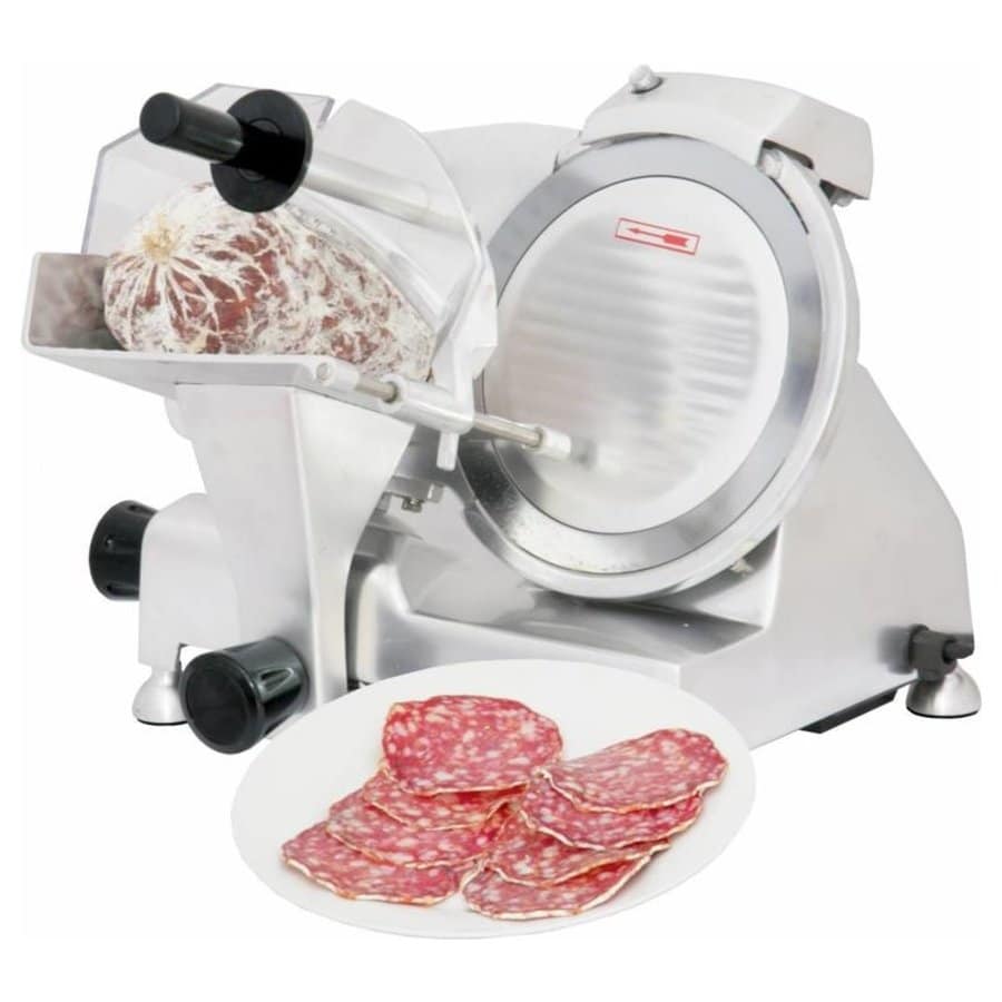 Il s’agit d’une machine servant à trancher et à découper du jambon et n’importe quel autre type d’aliments, comme les saucissons, le magret de canard, les saucisses de divers diamètres, la viande de bœuf, etc. L’équipement permet même de trancher et de découper du fromage, du pain, des carottes, de la tomate, etc.